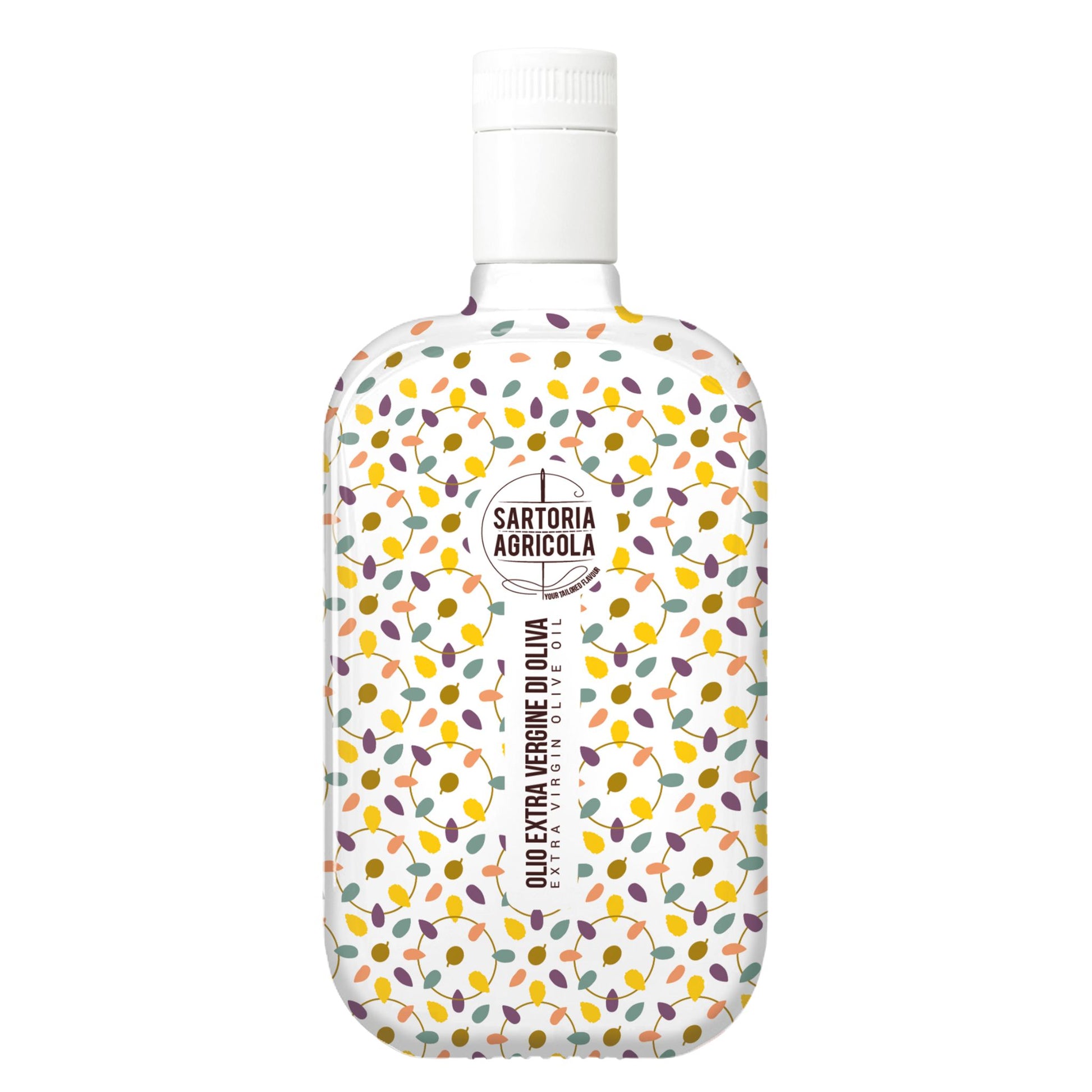 The botanical patterned bottle expresses the winter olive grove: layered leaves, rhythm, and Mediterranean nature. A refined design that feels at home in the kitchen and on the table, created to be used daily, not saved.
